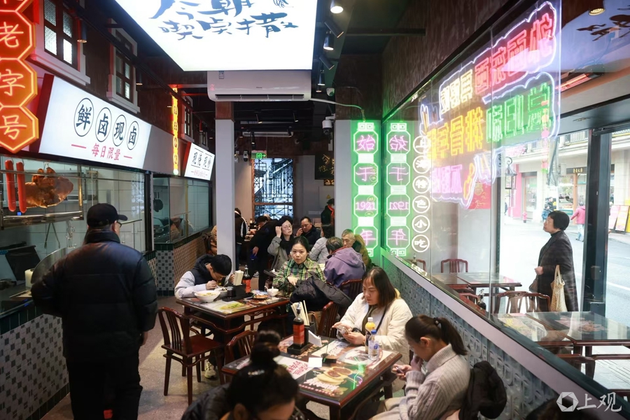门店口设置了外摆位。尽管室外只有5摄氏度,但外摆位上的暖灯一开,人坐在位置上一点都不冷。不少顾客抢着坐在这里。鲜得来排骨年糕总店负责人说,最近观察到南京路商圈客流的特点,将门店延长营业时间到凌晨1时。