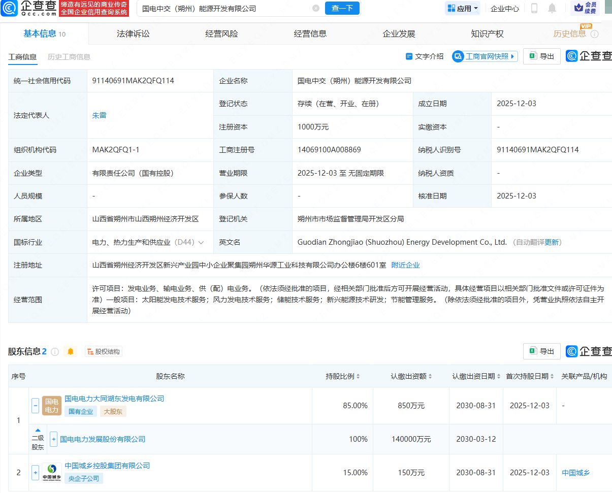 近日,国电中交(朔州)能源开发有限公司成立,法定代表人为朱雷,注册资本为1000万元,经营范围包含:发电业务、输电业务、供(配)电业务;太阳能发电技术服务;风力发电技术服务;储能技术服务等。企查查股权穿透显示富源优配,该公司由国电电力(600795)全资子公司国电电力大同湖东发电有限公司、中国城乡控股集团有限公司共同持股。
