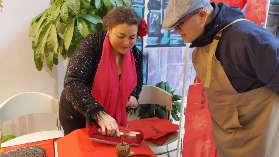 在一楼非遗互动体验区,写春联、送福字、古法拓印等摊位吸引外国友人们体验。安娜·埃弗努已经在上海生活了28年,也在这里过了28个春节。此前,她在嘉兴路街道参加过2次法语歌曲大赛,在这次大联欢现场她演唱了一首法语歌曲《玫瑰人生》。她感到,不同文化背景的人在上海都能被真诚接纳,尤其是这些年,春节前后她常常接到迎新活动邀约前去观演、表演,认识了很多朋友,“我很喜欢在上海过年的氛围,今年准备约在上海的朋友们一起逛街游玩”。